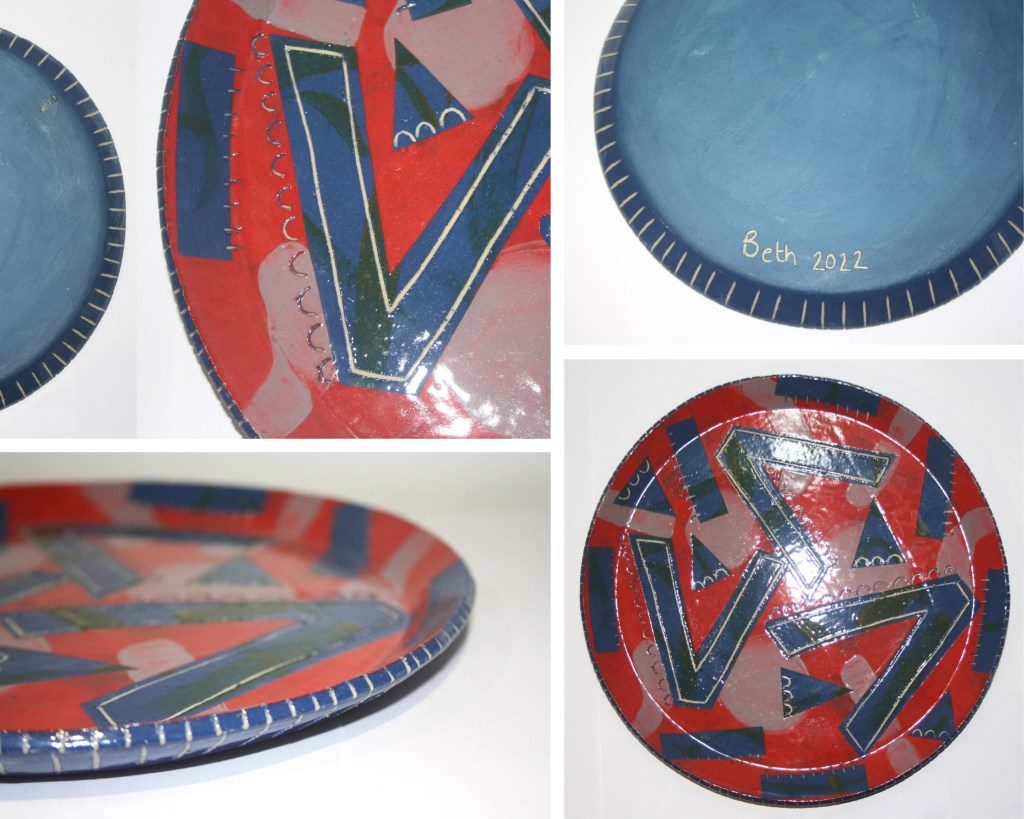 For this piece, I wanted to use really rich, dark colours. The cobalt blue and splashes of deep green under the red contrast beautifully. I used sgraffito to highlight elements of the design and enjoyed continuing the decoration onto the back of the plate.